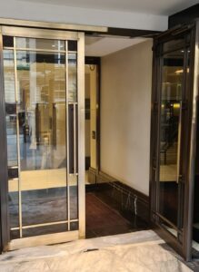 The restoration process involved a careful full strip and refinish of the bronze elements using specialist Bronze Solutions, polishing pads, hand tools and manual abrasive techniques to control finish depth and texture. Satin brass kickplates were mechanically polished using a precise abrasive pad method to achieve a consistent brushed surface.